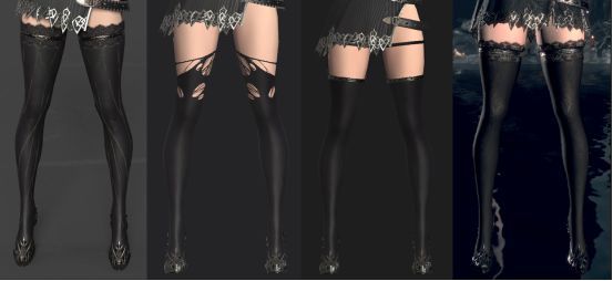 如上图所示,在早期版本的时候,我们曾设计了若干个腿部着装的样式,但均难以达到原画中的那种包含暗纹的半透丝袜材质感。显得十分油腻,仿佛涂满了凡士林的塑料。于是3D设计师开始对这种特殊纤维材质进行了研究。