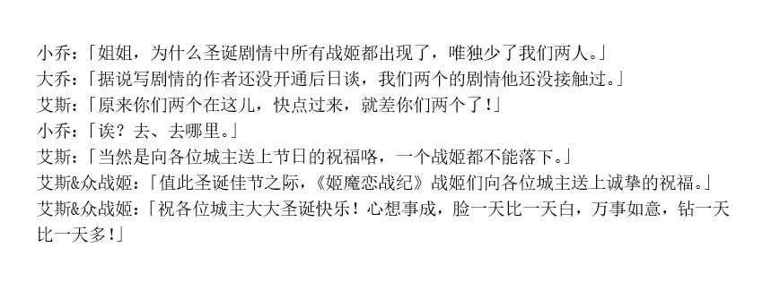 9个小故事,艾斯携手众战姬为各位城主大大送上圣诞祝福。篇幅有限,不能展开写,又要尽可能地把不同战姬嵌进剧情里,所以会有些突兀,图一乐就行。