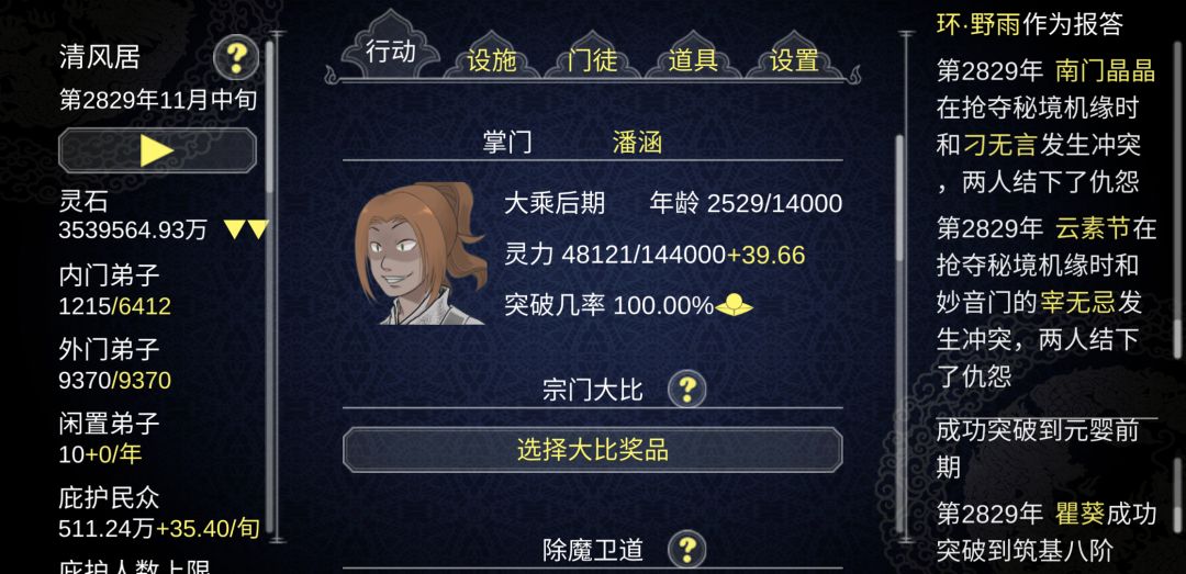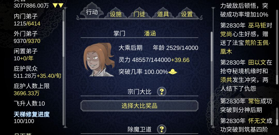 剩下的其他各个峰都不用去招呼,爱开不开,在你的大乘期大佬达到15个之前你的整个游戏过程就是补充一下丹鼎峰和百器峰的堂口和副手位的缺口,然后就是一直盯着最高三个等级的各个弟子的突破率,对于天灵根和变异天灵根换一下增加修炼速度的1装备和及时用丹药提高突破率,主要关注中期,后期和圆满这三种,初期的就不用刻意去关注,时间花在刀刃上,都看好了,其他时间就盯着主界面发呆吧。