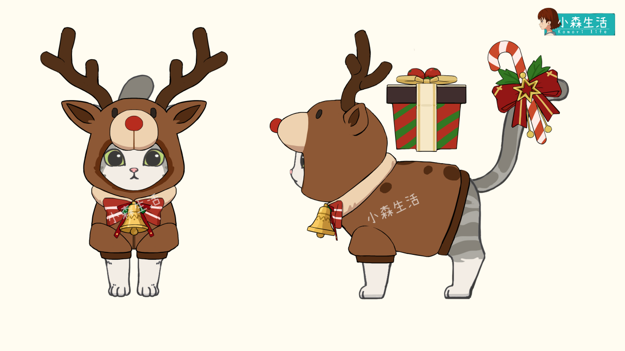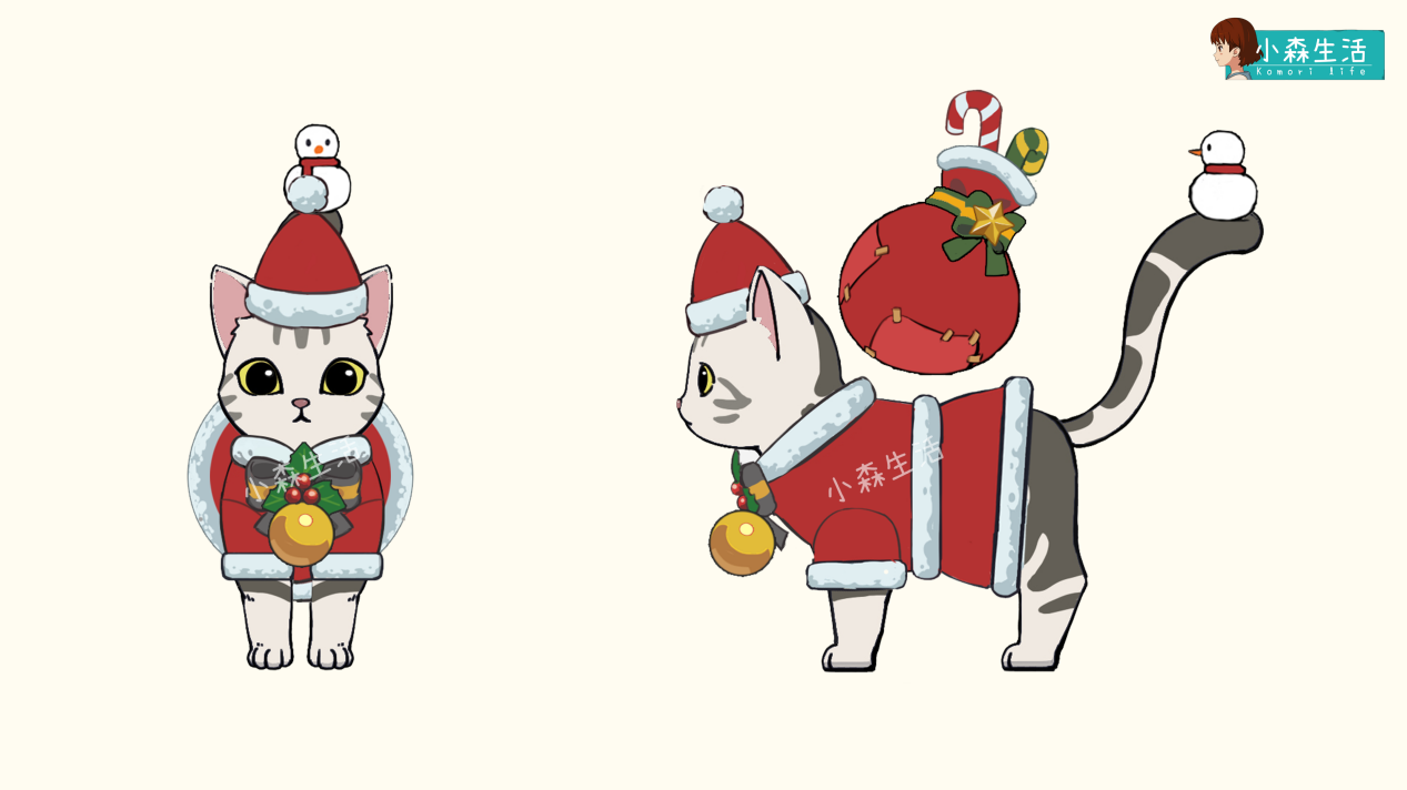 不光是花音自己,在这盛大的节日期间,猫崽崽们也可以和大家一起换上全新的圣诞套装。来看下面两款猫猫的套装,不知道村民们更中意“圣诞小猫套装”还是“雪橇小鹿猫套装”呢?小朋友才做选择,花音必须两个都要~