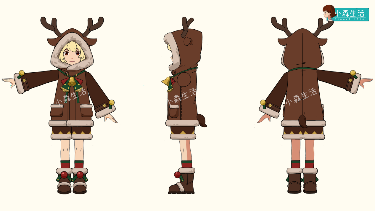 圣诞节的故事中,圣诞老人是乘着雪橇前来为孩子们派送礼物的,而负责拉雪橇的领头驯鹿就是大名鼎鼎的鲁道夫啦!花音也同样也准备了保暖又有趣的鲁道夫套装,棕色的连帽外衣搭配两只鹿角,还有胸前的铃铛装饰和背后的雪橇饰品,看起来有些笨重,因使用高科技材质制作,实际上非常轻盈哟~