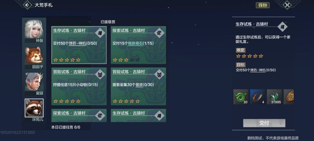 当玩家角色等级到达25级时,大荒手札内会增加一条名为“环狗儿”的任务线路,让玩家前往异人村寻找种族神像,交互可接取星级不同的悬赏任务,悬赏任务完成后需要主动交付完成才能获得奖励。悬赏任务星级越高,重要的是此任务是根据玩家等级来提供奖励的多少,完成后获得的奖励越丰厚,其中包含高额经验。每日限接取6个悬赏任务。所以我个人推荐玩家先把秘境试炼的5场打完再来接取悬赏。
