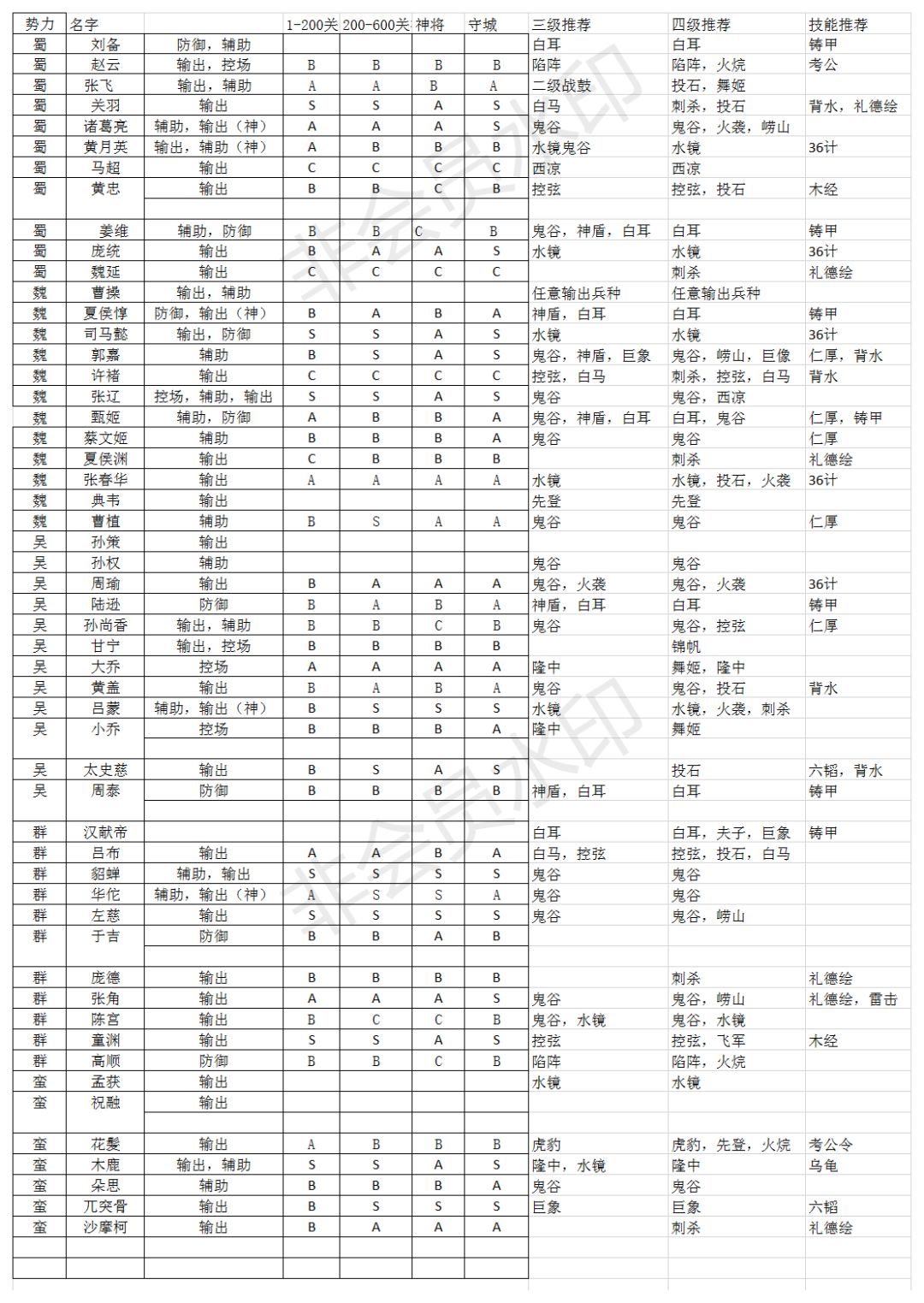 Ps:S级是核心,A级是强于平均强度,B级是平均强度,C级是弱与平均强度,这个是以满技能对比。