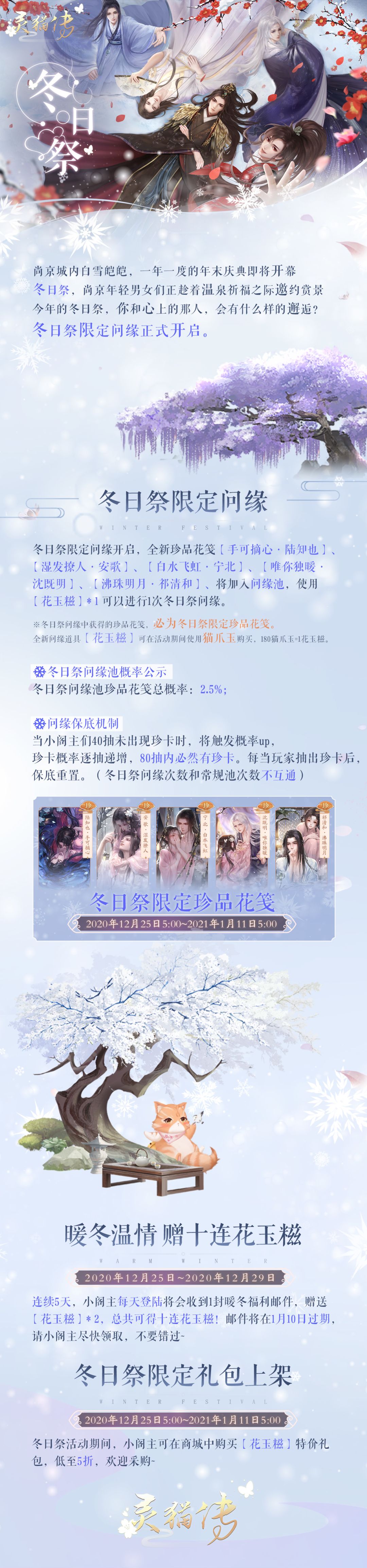 【连续登录送礼】:活动期间连续登录5天,每日赠【花玉糍】*2,共赠送【花玉糍】*10冬日祭问缘中获得的珍品花笺,必为冬日祭限定珍品花笺。