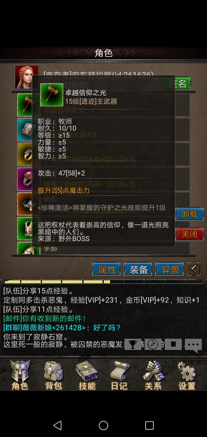 〔牧师武器及装备〕前期建议穿遗迹隐士套(特别头的属性对新手玩家非常好,有提升5%经验获得),主手武器用信仰之光(加守护之光一级这个属性很不错,也就说假如你本来守护之光等级是1级,戴上这武器后守护之光瞬间就变成2级了);副手华丽谜语(杀死敌人回复5%魔法值很实用,当然喜欢防御高点的也可以戴盾),项链戴治疗项链(各职业都非常有性价比的项链),戒指,手镯前期少,有什么就带什么。