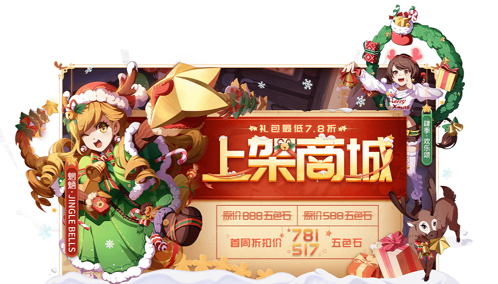 12月23日 更新后~1月6日10:00上架商城,内含明星“肆季”及时装“欢乐颂”“Jingle Bells”。原价1964五色石,上架期间7.8折出售。