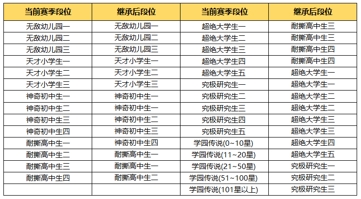 新赛季开启时,将根据玩家上赛季的[当前段位]进行赛季段位的继承工作。