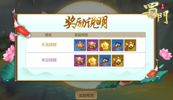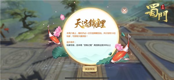 丰厚的奖励,刺激的玩法,天选锦鲤值得你的尝试。独一无二的天选锦鲤是兼顾努力、实力与运气的存在,遗憾未能当选的蜀友也请坚信好运总会发生在下一个转弯。想了解更多有趣的玩法,敬请关注《蜀门手游》官网。