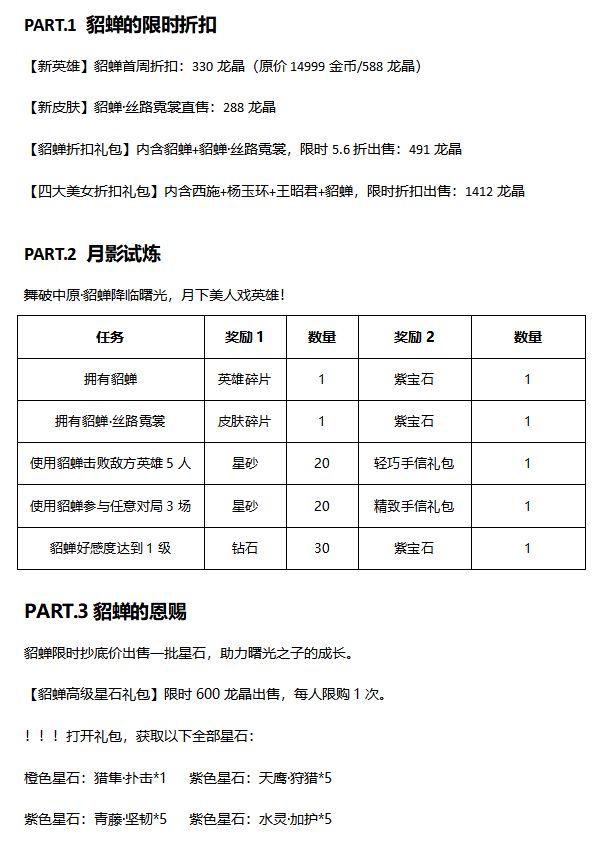 活动期间,貂蝉英雄,貂蝉皮肤上线享限时折扣,使用貂蝉完成一系列任务,获取丰富回报。