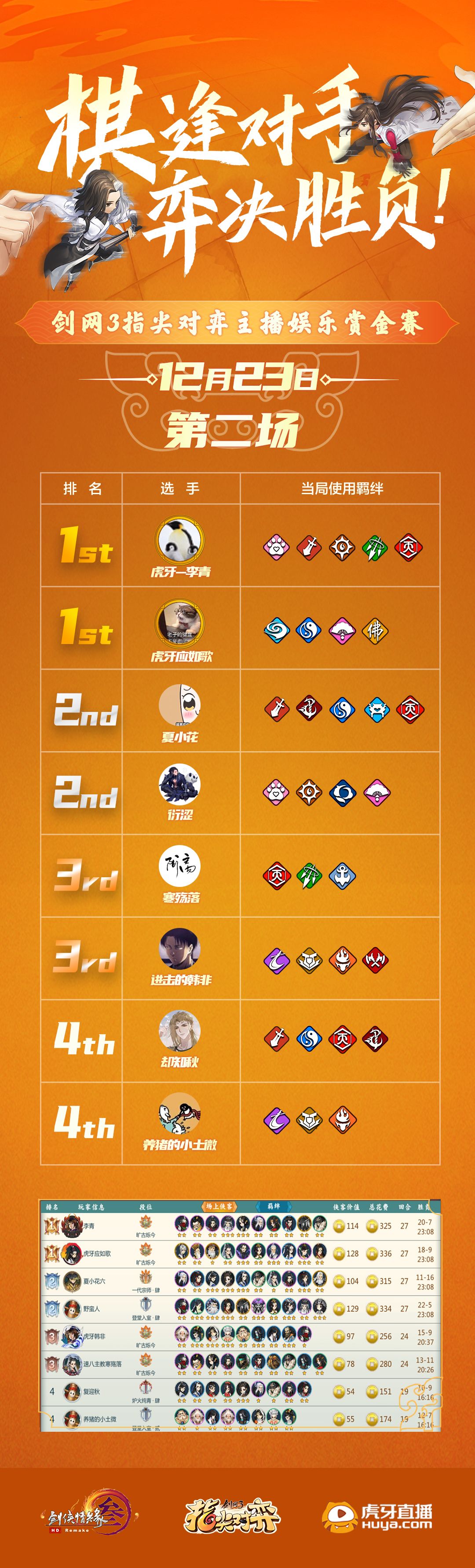 24回合进击的韩非&寒殇落的队伍也重伤出局。27回合,虎牙应如歌凭借李忘生鸿蒙一击,重伤了夏小花&衍涩的队伍,夺得了本局比赛的第一!