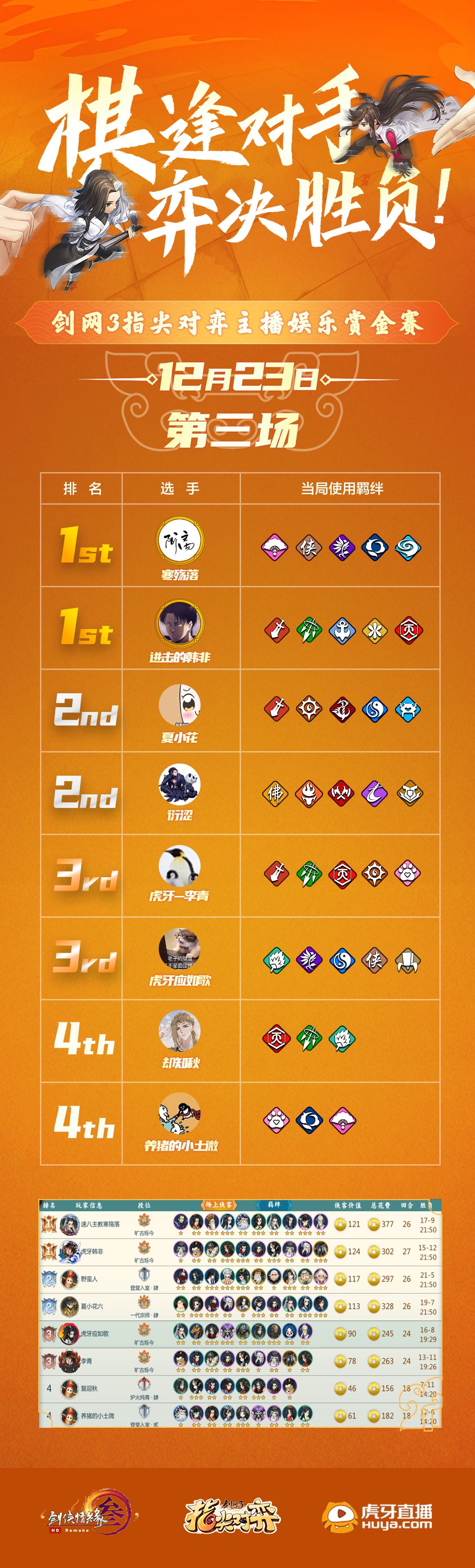 选手排名:【炜炜一笑很倾城】寒殇落&进击的韩非、【萌萌奶与冬草草】夏小花 &衍涩、【十回合源明雅0/9】虎牙应如歌&虎牙--李青、【却知秋为什么不无敌】养猪的小土微&却知秋