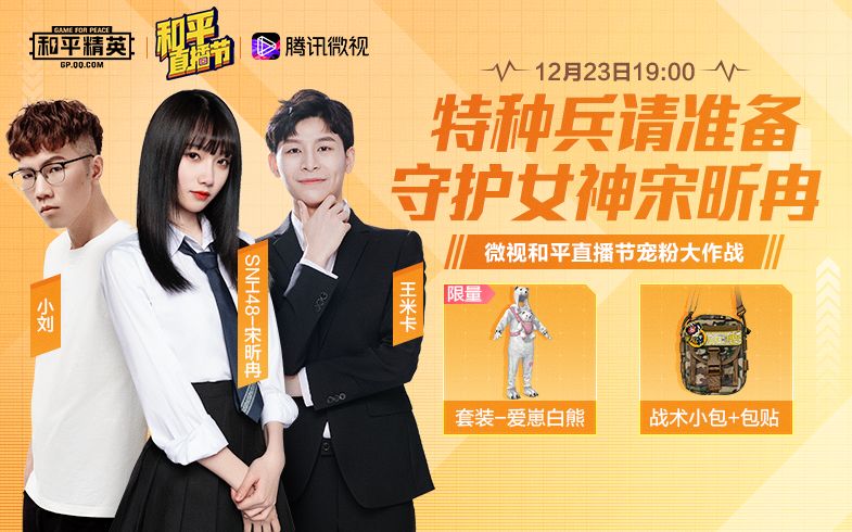 想知道王米卡和小刘会与SNH48宋昕冉会碰撞出怎样的火花吗?12月23日19:00来微视APP搜索”和平精英直播节”进入直播间,看高冷大神如何守护”女神”宋昕冉,海量Q币、限量皮肤、周边、签名海报等你来拿!