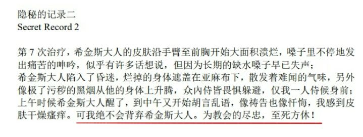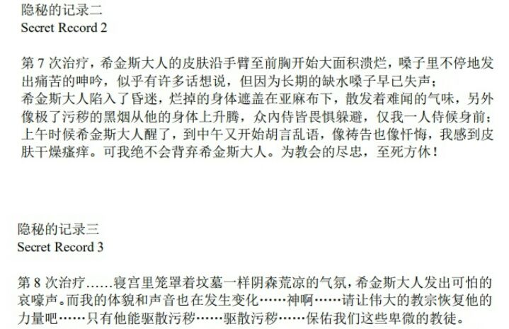 再回头看文献,记录二、三中明确表明仆人霍恩出于对教会和教宗的忠心,在已知教宗感染污秽的前提下依然选择留在寝宫照料,最终也被污秽侵蚀。