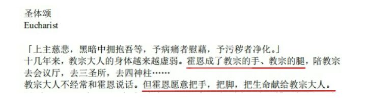 从圣体颂的物品描述可知,主仆间的交流其实相当有限,这很可能让霍恩产生“我只需为教宗默默效力”之类的想法或愿望。