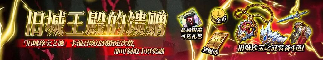 活动期间,在「旧城珍宝之谜」卡池中召唤达到指定次数,即可领取「旧城珍宝之谜」卡池UP装备四选一礼包等丰厚奖励!