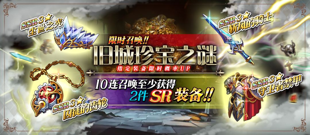 限时召唤「旧城珍宝之谜」中SSR级装备斩风的骑士、守卫者禁甲、尘世之光、囚徒的齿轮出现概率提升!