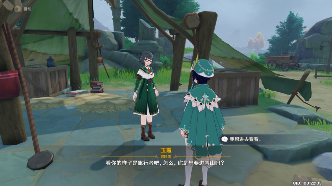 初临雪山的旅行者路过了雪山附近的一片营地,此时,营地的冒险者玉霞似乎遇到有什么事,上前询问后得知山上有奇怪的冰需要去调查。