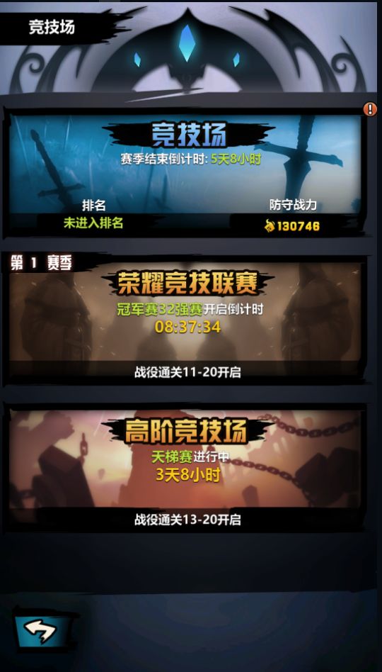 高阶竞技场:选择自己三队阵容,去挑战其他玩家,提升自己的排名和段位,排名越高,产出的材料就越多,材料可去商店换取英雄,且还有额外的奖励,每日奖励,赛季奖励,段位奖励,主要产出有蓝紫英雄碎片,抽卡券和火柴(太多了,具体高阶竞技场右上角)