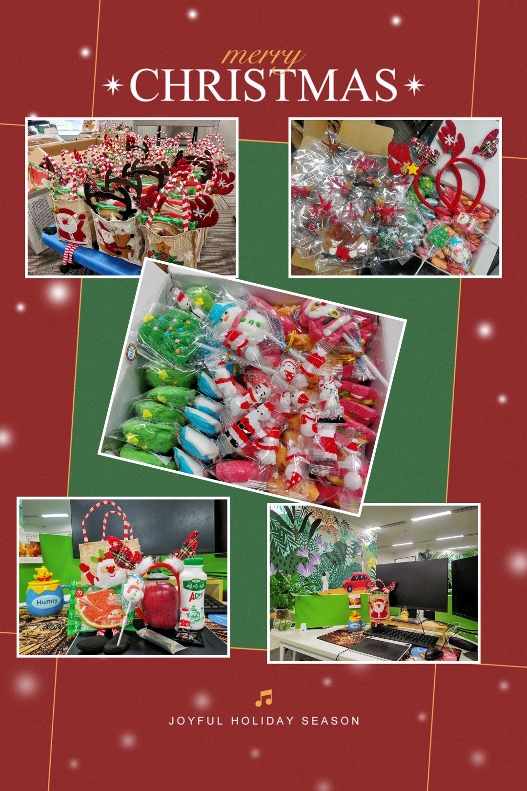 书童一早来公司就被圣诞的氛围给包围了,每位小伙伴的工位上面都有贴心的圣诞礼物,不同的是小姐姐圣诞礼物袋里面有一对麋鹿发卡,而小哥哥的袋子里发卡都变成了一袋子枸杞!书童摸摸了还算合格的发际线感到了一丝欣慰。