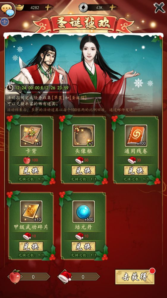 圣诞节日卡背、圣诞节日头像框、通用残卷、甲级武功碎片、培元丹