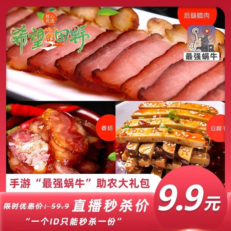 蜗牛助农产品:最强蜗牛专属礼包,内含后腿腊肉、香肠、豆腐干。