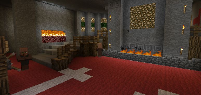 拉下拉杆,第一排红石火把亮起,城门流出岩浆,抵御敌人