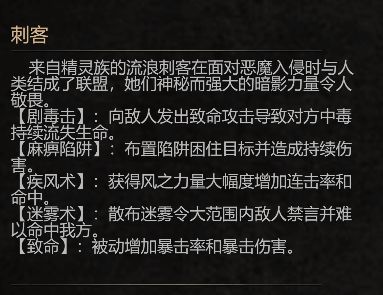 刺客汇聚了所有职业的特性优点,有输出,有控制,可以给加自己状态,可以持续输出,高暴击,高闪避,高连击,高命中,高攻击(万金油职业)‘