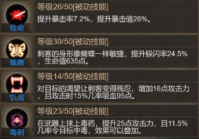 先带大家来了解详细的技能,刺杀,闪光雷,剧毒击,麻痹陷阱,疾风术,迷雾术。被动技能;致命,蝶舞,饥渴,毒刺。