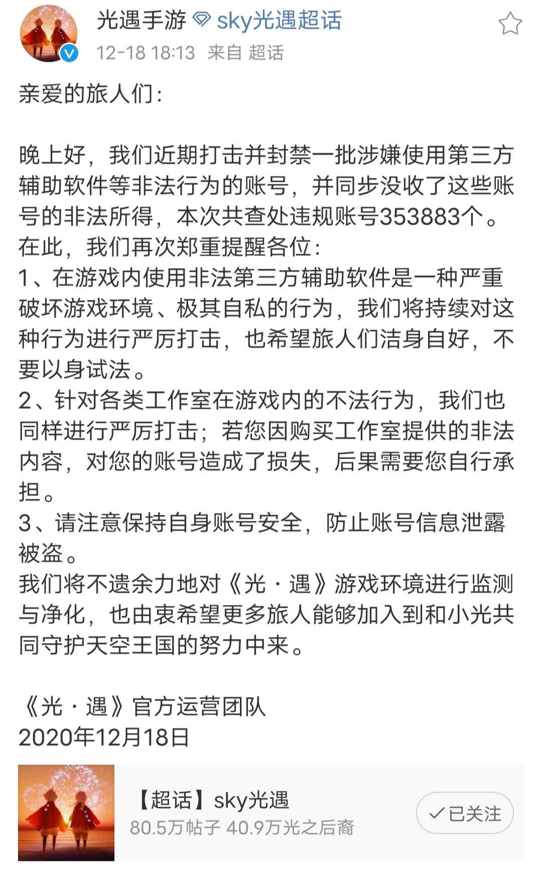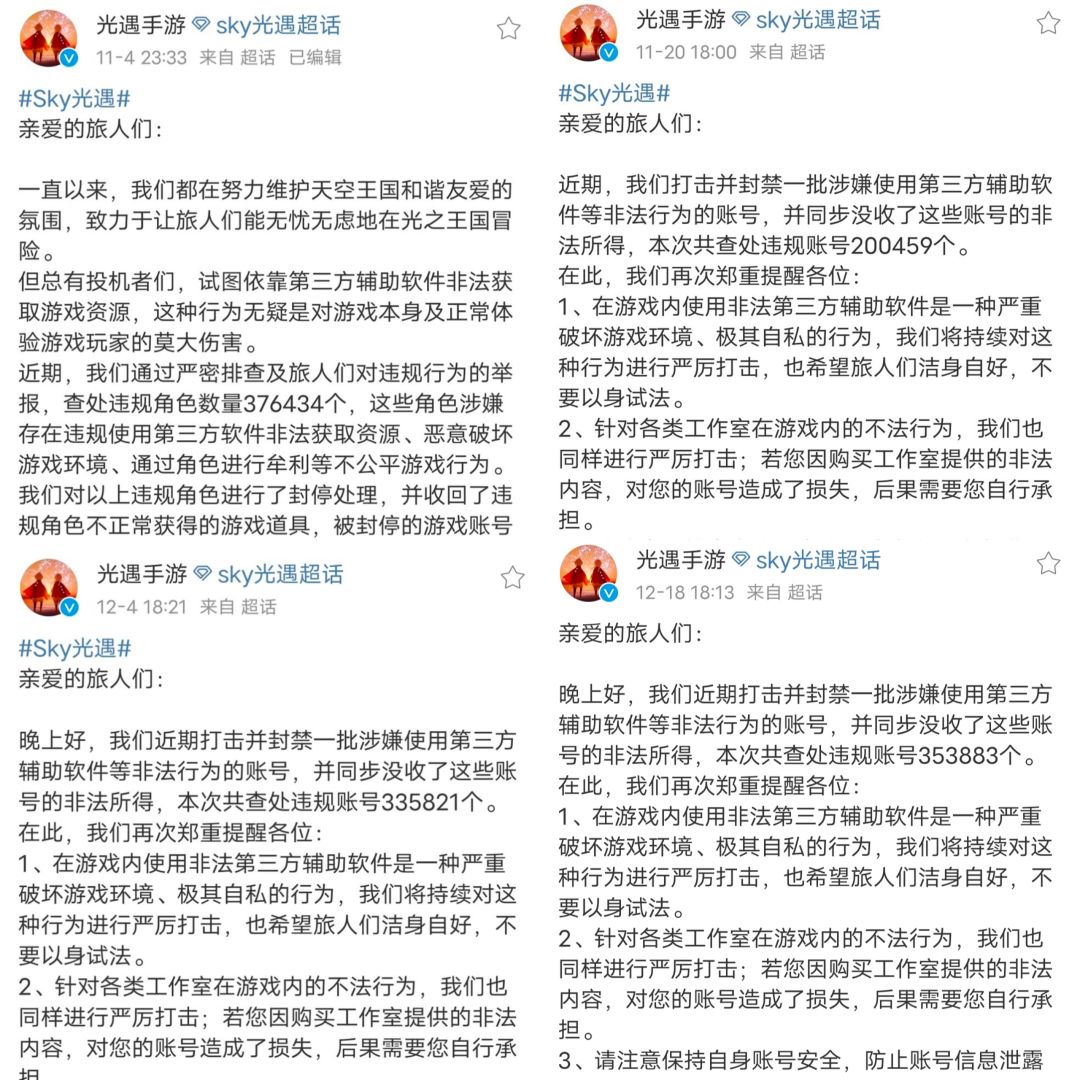 截至12.18,根据你们官博的数据,光遇国服已经累计封禁126.4万账号。但就像我之前所说的,封的依然是一次性的“卖心号”,也正好是外挂不要的号。