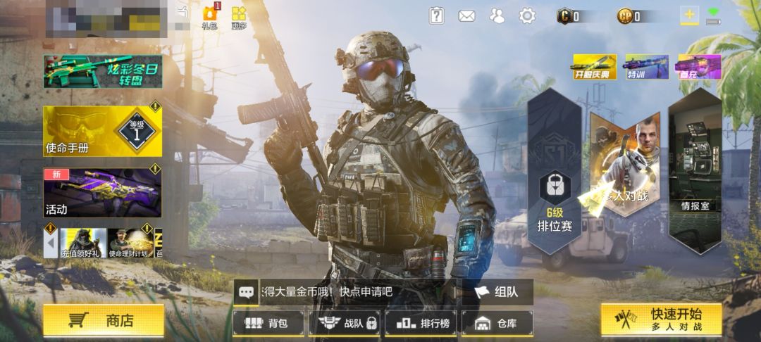 值得诟病的是游戏的UI设定。当我打开这样一款在外服上线测试一年的游戏,还是不免对UI产生了一定的质疑:活动、充值与必要的布局混在一起,布满了整个屏幕,让人觉得十分冗杂不堪,一股页游味儿扑面而来。个人建议作为一款fps游戏,尽量将氪金和活动归纳为一两处小地方显示,或者为其设计另一个页面来展示,避免不必要误触以及杂乱的主页。(详见下图)