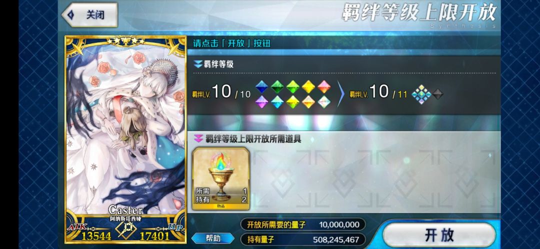 皇女,开服抽到的第二个五星从者,第二个满羁绊的,巧的是,我入坑的时候是2.1刚开的那段时间,在还是萌新打第一部的时候不管是打什么我都会把她带着的,现在嘛已经准备打2.51了,现在的我应该也还算萌新吧~自今天打了皇女的幕间之后,我决定努力把皇女慢慢的升到15绊,一切都是为了抽到C呆做的准备嘛~等抽到C呆我一定会想办法把皇女补宝的!以后皇女一定不会在待在冷冰冰的仓库了~