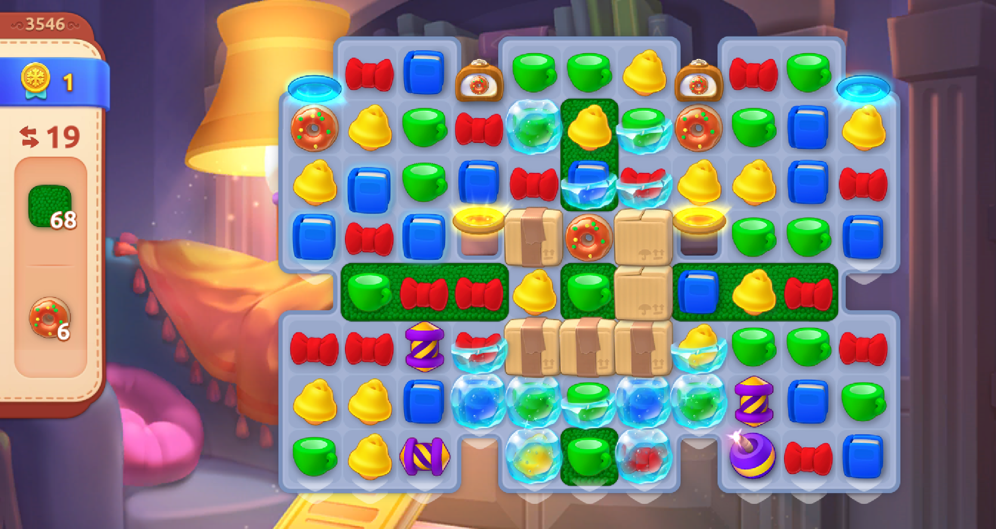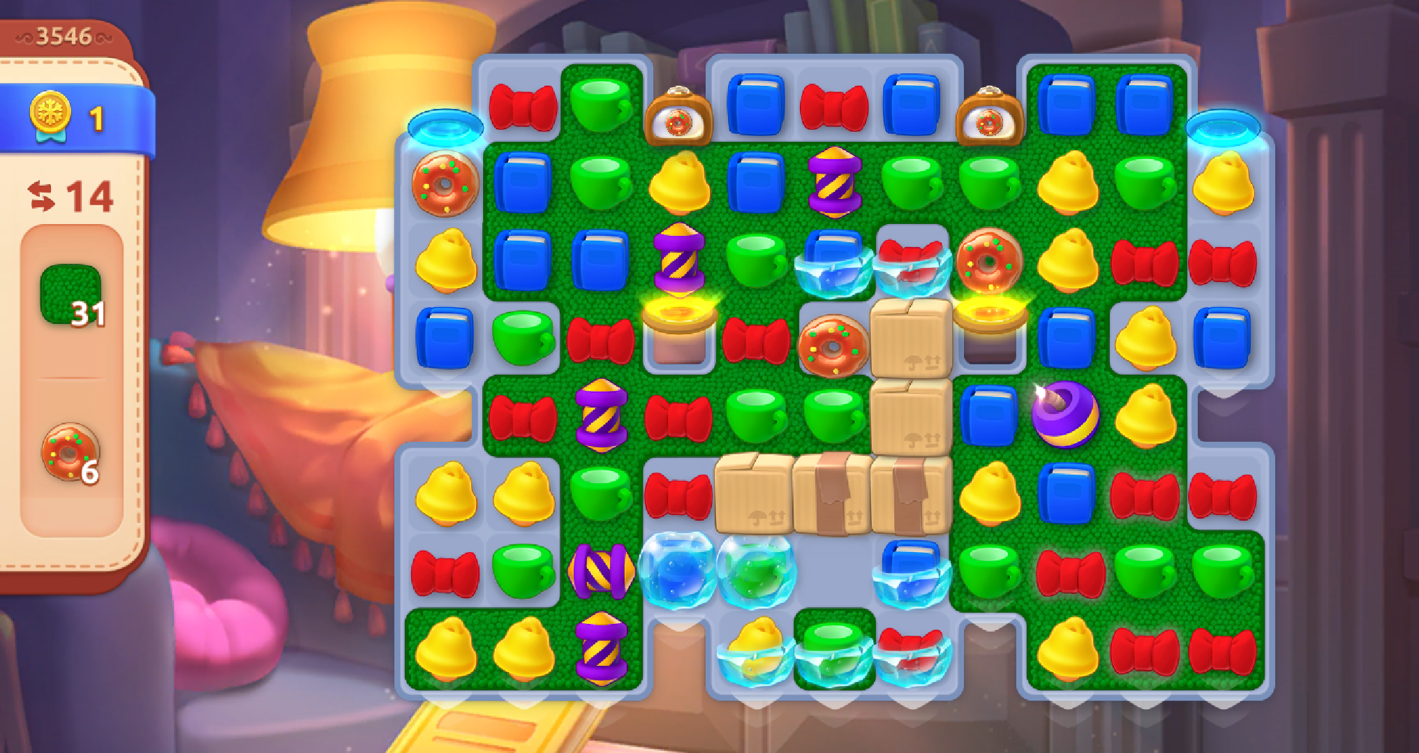 本局的主要障碍物就是冰冻,纸箱,在正中央有一个草地卷,激发就可以铺开一块十字形草地。这局看起来障碍物很多 ,其实也有一些隐藏的福利 ,比如:草地卷利于铺开草地,在开局时比较大概率可以组合道具。在开局时要多注意元素的分布位置,合理利用,多多组合道具,如果开局时元素的位置不太好,可以尝试重新开始(开局后,不要走动,直接退出,再次开局,会刷新开局。)