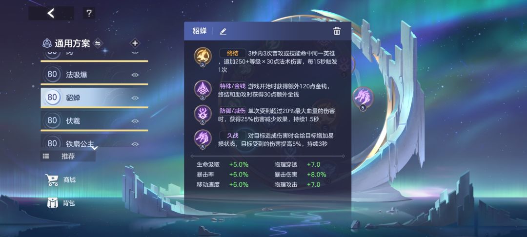装备六:耀光壁甲 提供攻击力,提高伤害,提供技能急速,减少技能冷却时间,提高生命值,提高坦度 被动弧光 使用技能后五秒内获得普攻强化,附带(80%总物攻)物理伤害,如果攻击命中英雄,回复(20+2x英雄等级)生命。(被动强化普攻,极大提高伤害,更容易击杀脆皮) 被动疾速 普攻命中提供15%移速(提高貂蝉机动性)