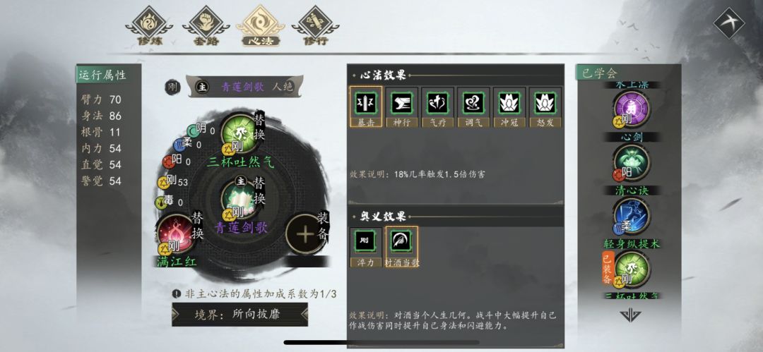 对纯新手玩家来说,我建议先用出生就练的侠客行。由于侠客行是刚属性,要为其搭配一套刚属性心法。主线附赠的满江红就不错,而在游戏进行中家门口出现了一位青莲剑客,击败他并做完任务会送一本位居人绝的青莲宝典。这时候可以以满江红为主,三杯和侠客心法为辅,当我们有了32内力和相应修为时就可以将青莲心法点上换到主位。由于招式在使用过程中会自然增长无需花费修为点,只需要点心法和气血就行了。