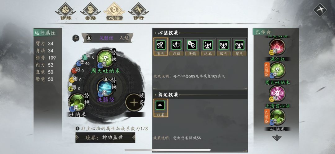 首先先介绍下心法机制,心法不仅可以加持角色的四维,也带有五种不同的属性。所有的招式也分阴阳刚柔毒五种属性,当你运行心法时相应的属性就会加成到角色上,其中辅助心法是1/3。招式的攻击力主要由外功加成、附伤以及属性加成组成。大部分情况下,当使用刚属性的招式时,刚属性加成是最高的,而相克的柔属性会倒扣威力,阴阳也是同样的,在新手阶段要尽量避免这种情况。