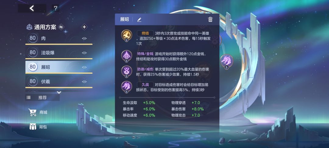 装备六:耀光壁甲 提供攻击力,提高伤害,提供技能急速,减少技能冷却时间,提高生命值,提高坦度 被动弧光 使用技能后五秒内获得普攻强化,附带(80%总物攻)物理伤害,如果攻击命中英雄,回复(20+2x英雄等级)生命。(被动强化普攻,极大提高伤害,更容易击杀脆皮) 被动疾速 普攻命中提供15%移速(提高展昭机动性)