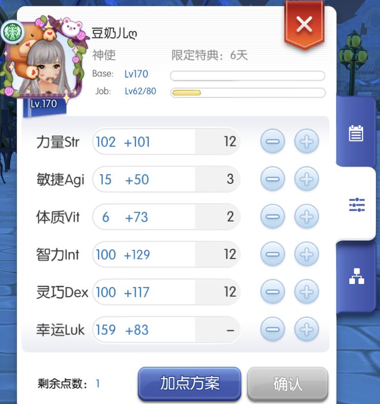幸运Luk加点满 力量Str和智力lnt对点 灵巧Dex加点取决于你加到多少无念巴德尔的冠冕(冠冕放进备战,点上星盘牺牲颂歌)敏捷Agi取决于吃满料理达到480%攻速。