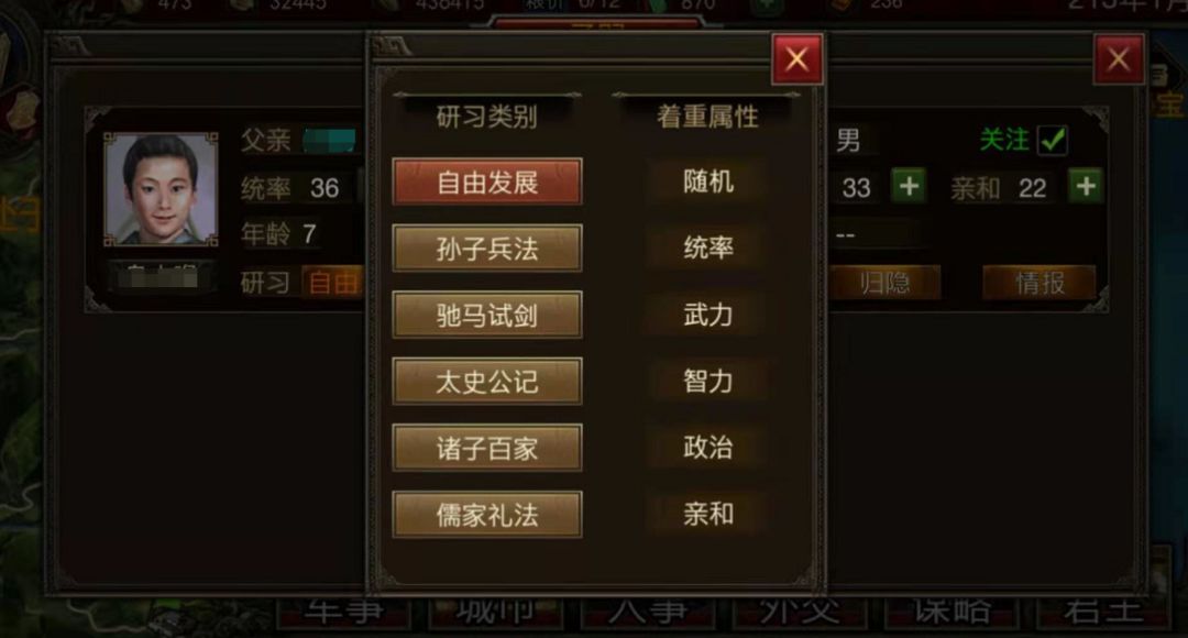 子嗣的基本培养就介绍到这里,在15岁子嗣出仕之后,则可以按照正常武将的培养方法进行培养。