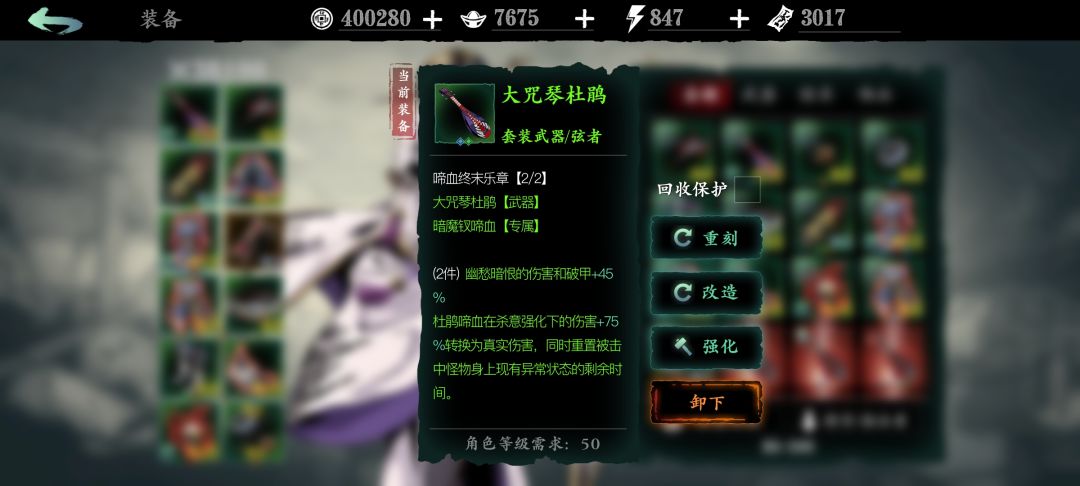 第三套是啼血套,这个就是比较中后期的套装了,等前期过度完,打到虚空裂隙就能刷到大咒琴和对应的钗子,两件组合成的效果,让幽愁暗恨和杜鹃啼两个技能得到非常高的增益。更重要的是,这俩装备的副本都是体力本,只要有时间(我是没什么时间玩所以…),肝一下可以比龙体套、女王套更容易到宗师。