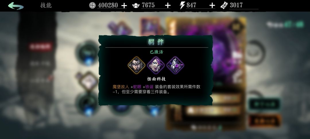 一套是是由“魔堡敌人+蛇眼+铁诞”组合成的怪面科技羁绊,效果是装备的套装效果所需件数-1,但至少要穿戴三件装备。这一套心法可以说适合于所有角色,到了中后期靠着这个羁绊,我们能做到激发一套装备八件组合效果的同时,再激活一套四件的与一套两件的,绝对的神级羁绊。