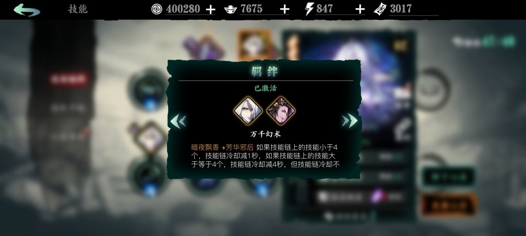 接着就是中后期必备的两套心法,一套是由“暗夜飘香+芳华邪后”组成的万千幻术羁绊,这是一套减冷却的心法组合,特别适合于上面那个两条技能链,装配上后,基本上可以做到无缝连招,对于魔弦这种很吃连招的职业来说非常友好。