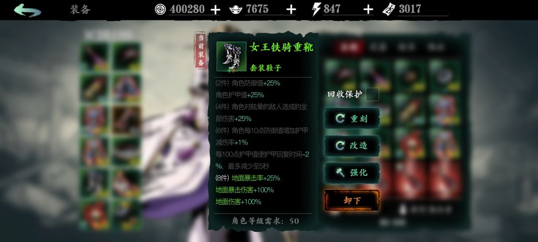 至于装备具体搭配方面,得益于怪面科技,我们只装七件就能达到套装最终效果,具体哪七件,个人建议的是最好有衣服、斗篷、裤子、护肩。因为装备最后还有个吞噬同装备进化到宗师的选项,所以如果选上面那四个40级就能获得的装备,那么后期就好直接刷爆率更高的40级去进化50级再吞噬到宗师。