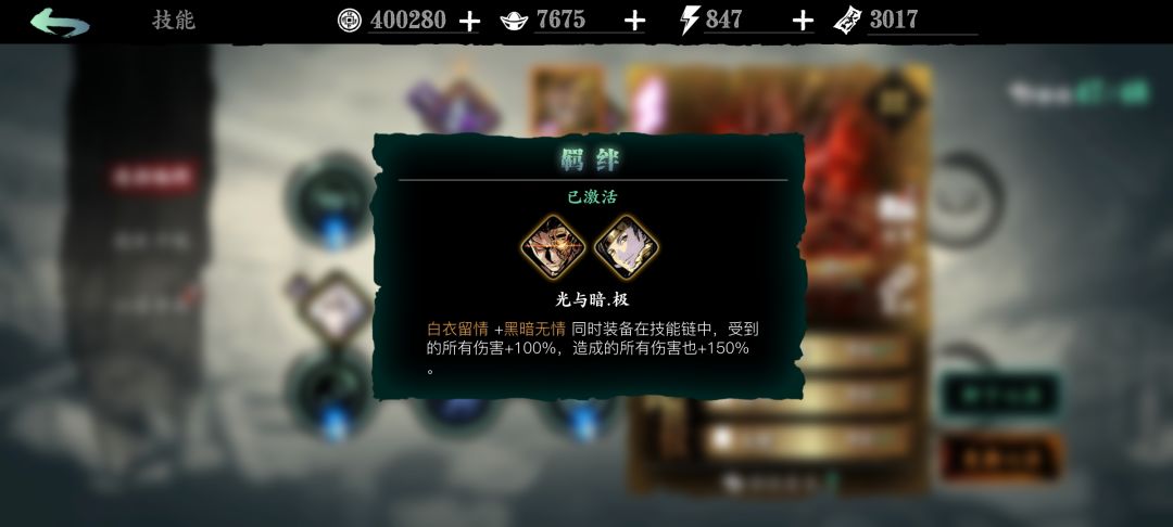 最后还有一套额外的,可能稍微比较难凑齐,但很适合魔弦,大家可以试着在后期稍微凑一下的组合。那就是由“白衣留情+黑暗无情”组合而成的光与暗·极羁绊,这套羁绊能让你造成的伤害+100%,当然受到的伤害也会+100%(升华后伤害+150%,受伤不变)。不过对于魔弦这种远程划水的高爆角色来说,反正也是都是只能挨几下,不如放开点打。