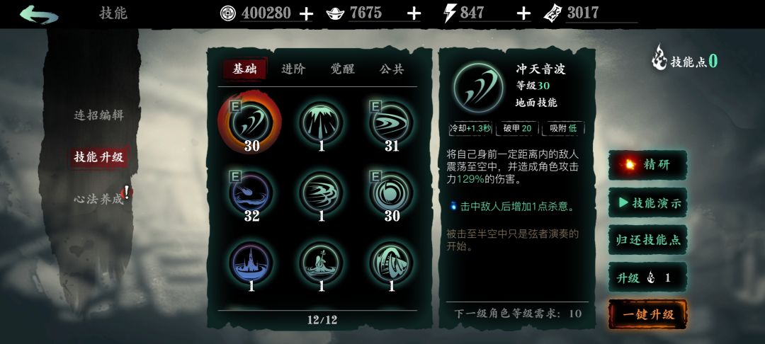 技能链2:冲天音波-裂帛-无骨舞姿-银瓶破