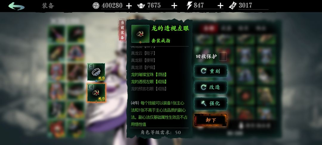第二套是龙体套,它的套装效果和怪面科技一样,都是能爆炸性提升实力的套装,四件套效果就是能装备副心法而不占悟性,但同时也只继承基础属性。相对来说它比女王套要更难得,主要在正道陨落副本中出,但也更为重要,前中期可以优先装备它,后期再慢慢替换(戒指是只有50级的)。