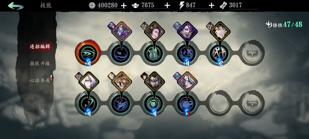 这里主要就是两个建议,一个是注意看看技能是消耗杀意还是积攒杀意,技能链上最好是一个积攒杀意接一个消耗杀意,或者俩积攒一释放。简言之把技能装上去后看看是加还是减,这个加减最后的结果是零就对了,先加后减是最舒服的。哪怕你很自信可以通过战斗时的闪避和弹反积攒杀意,但技能链有自循环的话,战斗时肯定是更流畅自如的。