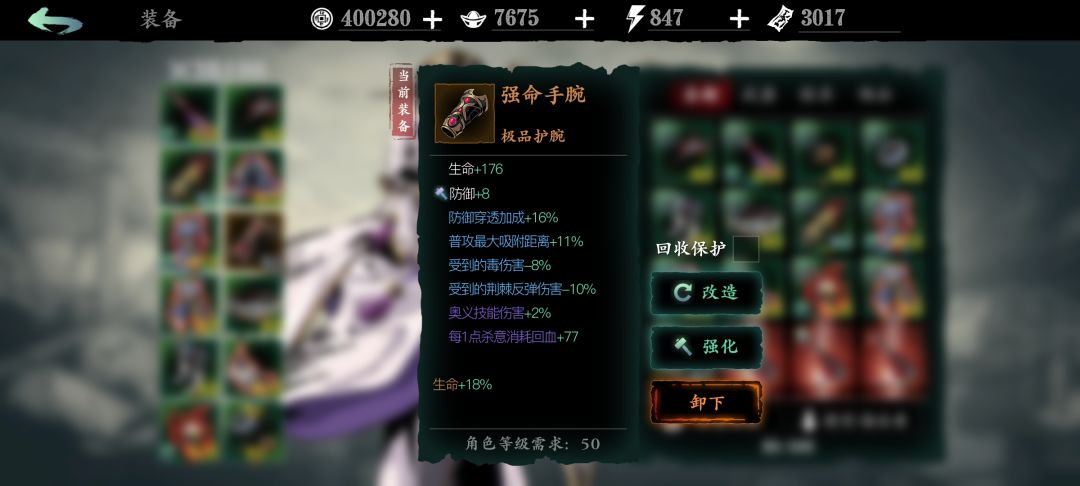 一个是橙色装备该分解就分解,那种词条和属性一般的,不用太在意去保留,可多匀点资源出来放在别的地方。因为橙色装备其实很好获得,并且没有那么大的强化空间。不过护腕和戒指可以稍微留意一下,比如护腕里橙色的“强命护腕”,可以按百分比加生命,到中后期仍然很有用。