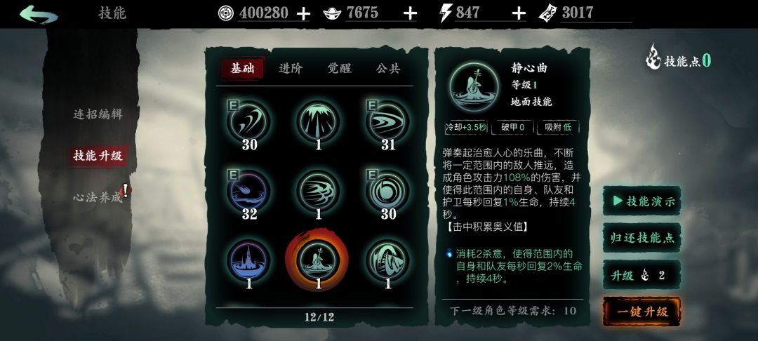 另一个建议是不要用静心曲,虽然它描述和数值让人看起来感觉很有用,但实际上到实战过程中,它不仅会消耗你积攒的杀意,更重要的是强制坐下会打断你的连招节奏。哪怕是到了可以召唤队友助战,或者是组队刷本的时候,这个技能也是很难起到作用,毕竟大家都在满天飞,你根本奶不着。