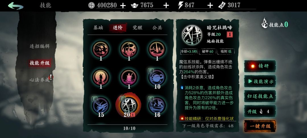 关于技能养成方面呢,我是有强迫症,所以都养的等级差不多。但想要强到极致,肯定是得多倾注于要消耗杀意的技能上,像我主输出的就是“杜鹃啼”,只是稍微向它倾斜,伤害就已经盖过了奥义,相对来说是比较推荐于主养这个技能作为主要伤害手段的。而且对于我来说有比较玄学、肯定是心里作用的一点,那就是我每次用这个技能作为终结敌人的杀招,掉好东西的概率都会增加不少。当然,重点还是好看。