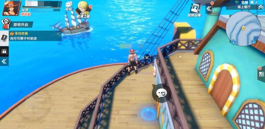 另外,有一点需要注意,桅杆的左侧(上图人物站立处)是向上去到“海上餐厅”三楼,而站在右边则是会下到一楼,会站在船头即上图中有海鸥的位置处。而在玩家下到一楼后,可与NPC(海鸥)进行对话。